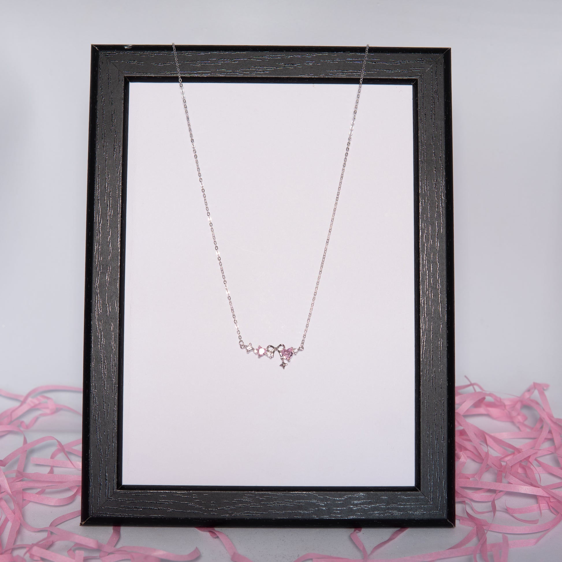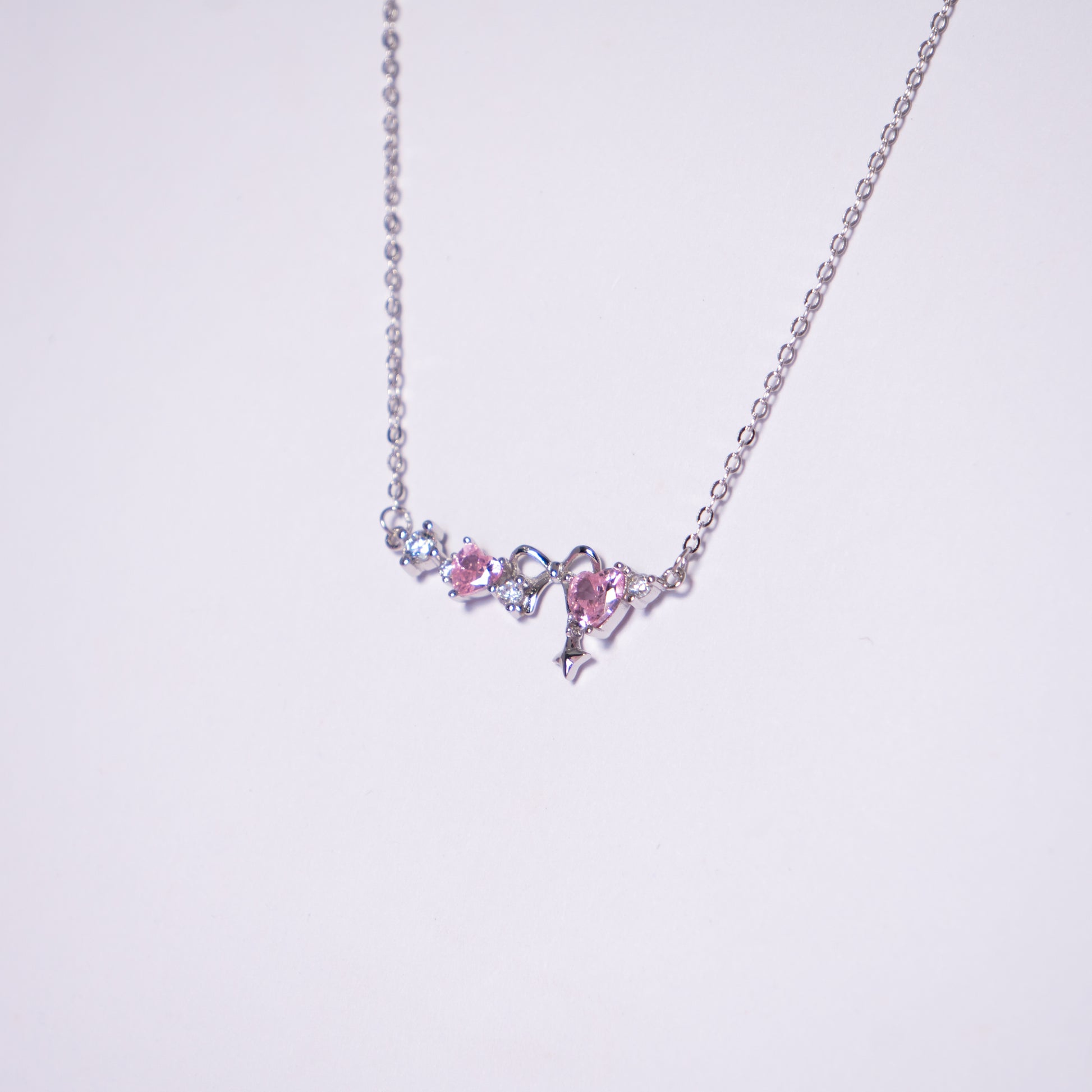 - Couleur du Collier : Argenté avec deux pierres roses et des incrustations de zircon